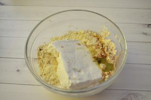 - Add the egg, olive oil and cottage cheese. Mix to homogeneity. If the cottage cheese is too dry, you can add a little kefir.