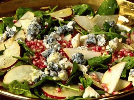 The salad consists of chopped pears, lettuce, pomegranate seeds, blue cheese and honey. Served with salad dressing cooked champagne vinegar, mustard, garlic and lemon juice. with friends: