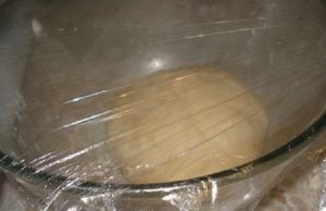 - Knead steep dough thoroughly with your hands so that it does not stick to hands. Knead for 15 minutes with effort. Let the dough stand 15-20 minutes, covered with cling film so as not to dry.