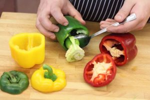 Wash bell peppers, cut off the upper part and pull out with a spoon seeds, peel the inside of the pepper (remove all white parts).