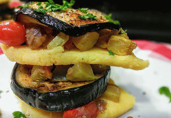 - We collect the turret, the first layer of polenta, stewed vegetables on it, eggplant, repeat layers, garnish with greens.