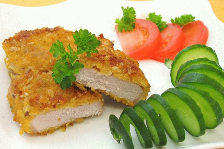 Very simple and quick to cook at home pork dish. It turns out delicious, juicy, crisp. In the finished breadcrumbs crackers can add your favorite dried herbs, such as rosemary, dill, parsley. Be sure to serve salad of fresh vegetables and just chopped tomatoes, cucumbers, and leaves green salad. On the side dish you can boil potatoes, rice.