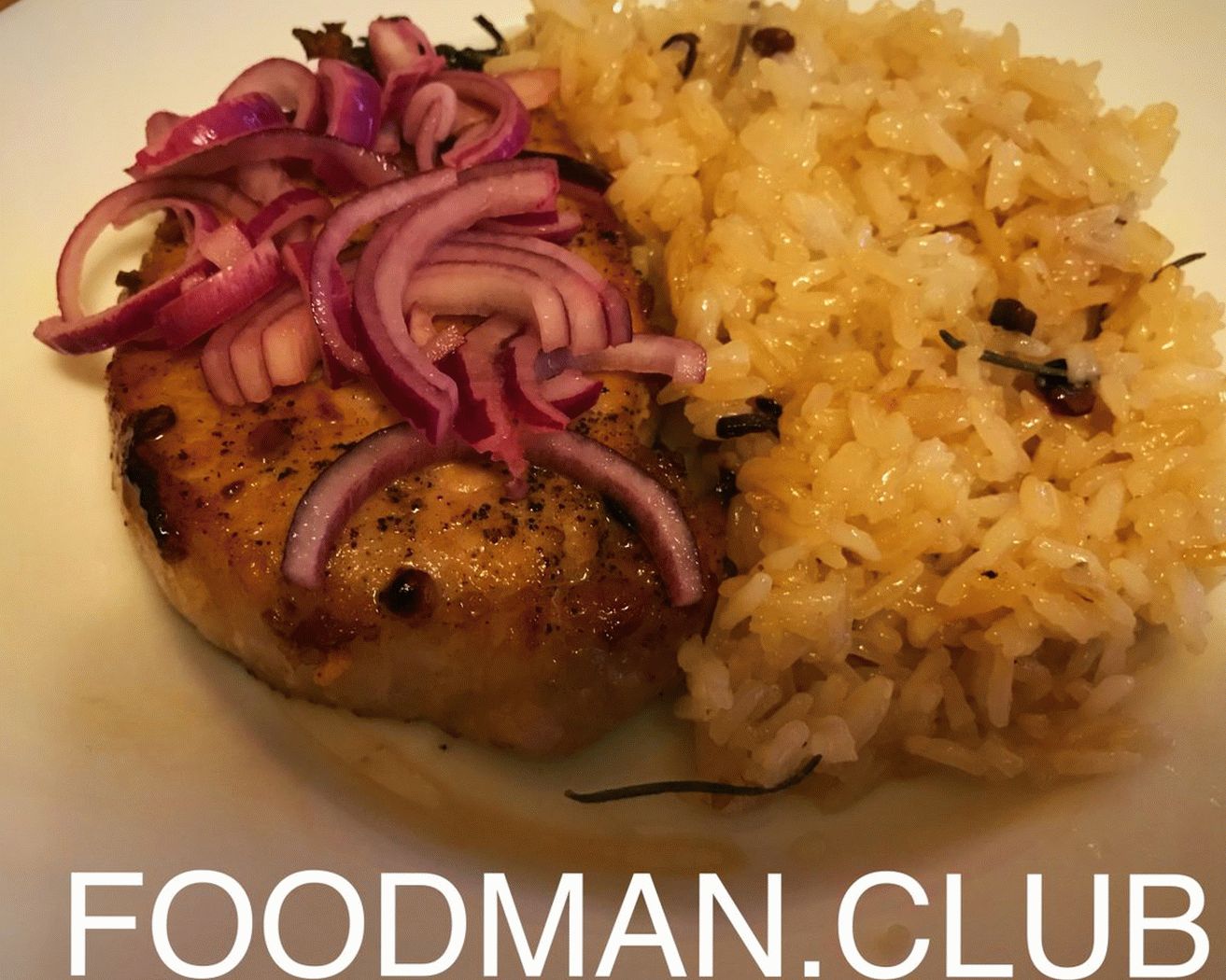 - Spread pork with rice and pickled red on plates. onions. Serve to the table, bon appetit!
