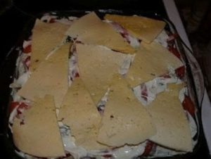 Spread tomatoes and cheese slices on top. Cheese must cover casserole surface completely.
