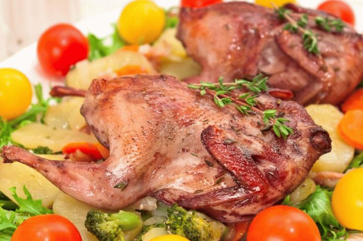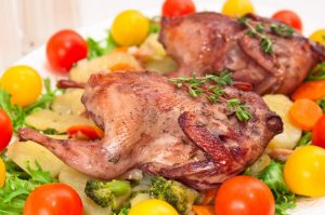 - Ready quail served with fresh vegetables and green salad.