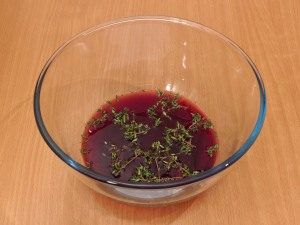 - For the marinade, mix the wine, vinegar, thyme (leaves) in a bowl, salt.