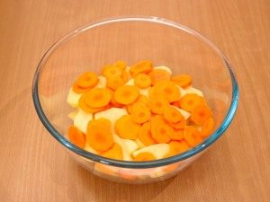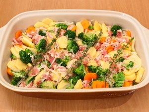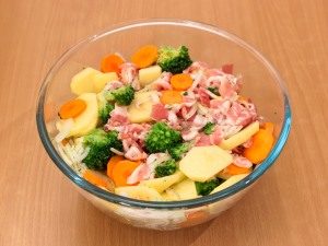 - Put potatoes and carrots in slices into a bowl, broccoli (non-freezing), slices of bacon, onion, chopped half rings, slightly salt, pepper.