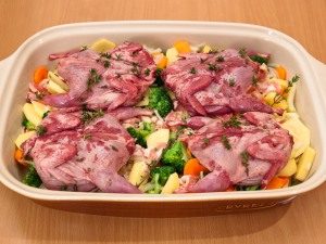 - Prepared vegetables with bacon oiled baking dish (with approximate dimensions 20 × 30cm), lay on top sprigs of thyme (or dry equivalent).