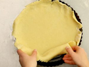 - Roll out the dough and put in a baking dish, closing bottom and sides.