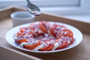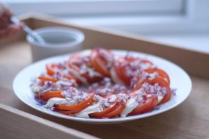 Mozzarella cheese goes well with juicy vegetables. Fast tomato and onion salad with balsamic dressing vinegar and olive oil are not only amazing in taste, but also very nice. It can be cooked at home and served with baked pork, beef or poultry on the festive table.