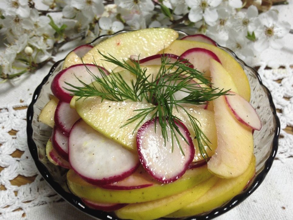 I advise you to cook at home a delicious salad of radishes and green apples. A spring, refreshing and light salad dressing is perfect for a snack.
