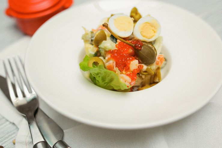 - We spread in a deep container, add capers, gherkins, olives and crab meat. Dressing salad with mustard and mayonnaise, mix and salt.