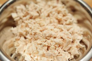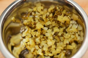 - Boil chicken fillet for about 15 minutes in salted water and finely chopped.