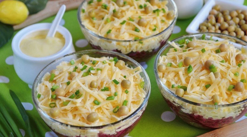 - Now you can collect the salad in portioned salad bowls or in one large layers: canned peas, beets, eggs, cucumbers, cheese and a net of mayonnaise. Better give a little salad insist and soak before serving.