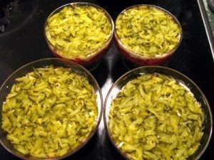 - Three pickled cucumbers on a coarse grater and squeeze from excess brine, as excess liquid in the salad we do not need.