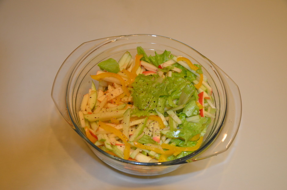 - We clear peppers from seeds, partitions and ponytails, cut into thin strips. Add apples and peppers to the salad.