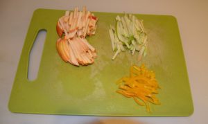 - Apples (I took red and green) are peeled and seeds (if desired, can be peeled), cut into thin slices or straws.