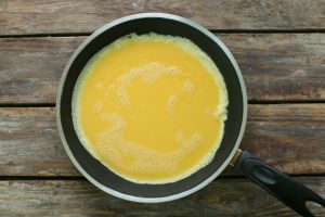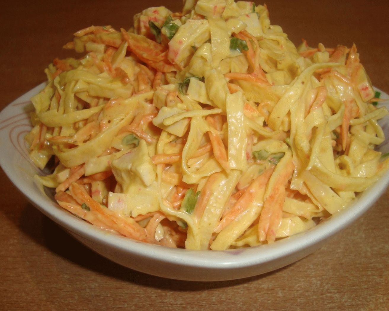 Salad with egg pancakes and Korean carrots complemented favorably tender crab meat. The dish turns out spicy and very tasty. Try to cook it at home for the holiday.