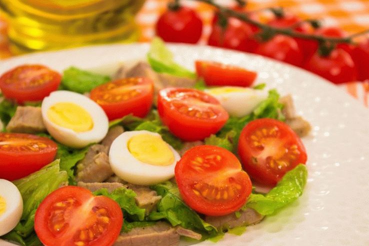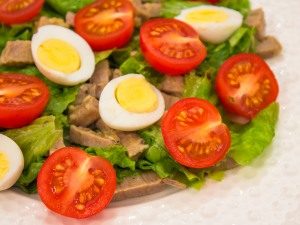 - Put the salad on a flat dish, spread the cherry and eggs.