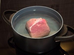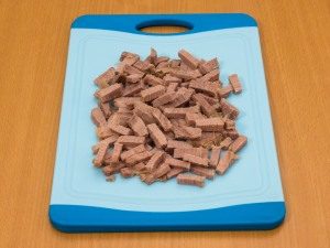 - Cut the chilled meat across the fibers with a sharp knife on small cubes.