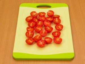 - Wash the cherry, also cut in half (ordinary tomatoes on four to five parts).