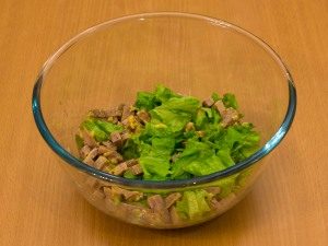 - Put meat, mix with green lettuce, pour dressing, mix gently.