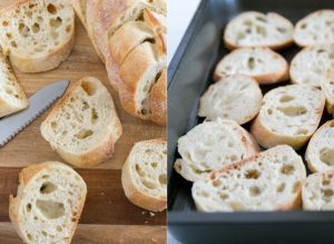 We put the oven 180 degrees. Baguettes cut into thin slices, spread on a baking sheet and put in the oven for 7-10 minutes until they become crispy.