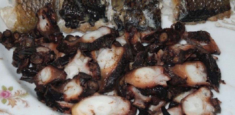 - We spread the octopus pieces on the grate of the smokehouse. Sprinkle its spices.