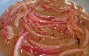 - Pour onion marinade and onion itself. Add finely chopped bacon, sprinkle with chopped egg and serve.