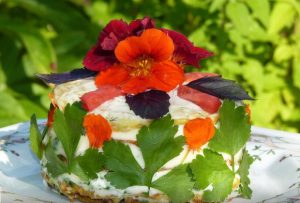 - Decorate the chilled cake with greens, parsley leaves, nasturtium (these are edible flowers).