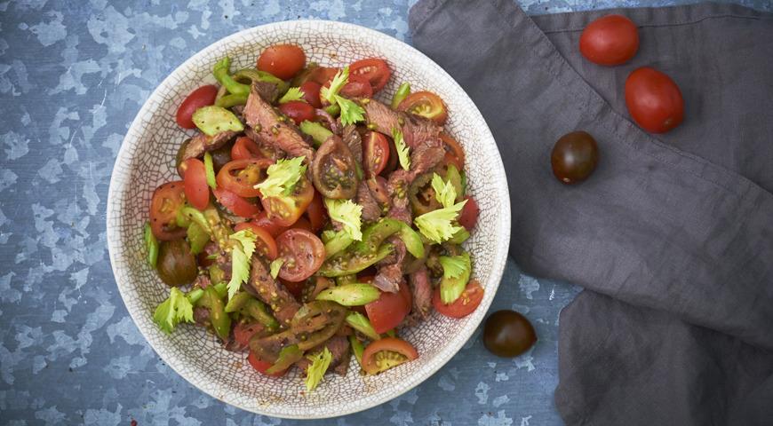 A delicious and hearty salad of steak, celery and tomatoes I advise you to cook at home for the arrival of guests or make on romantic dinner, he certainly will not leave anyone indifferent.