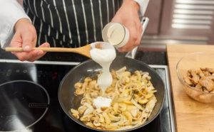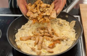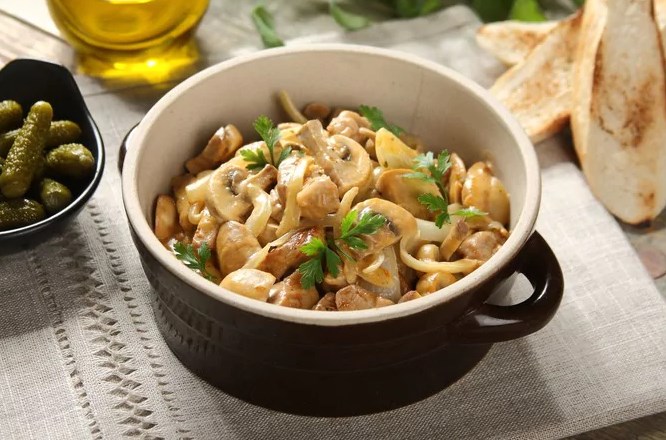The classic home-made recipe for delicious pork Stroganoff style of tenderloin, onion and mushrooms with adding sour cream.