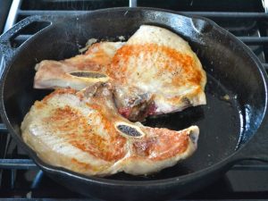We wash the pork patties on the bone, sprinkle with salt and pepper. We spread the prepared cutlets on the bone in hot oil and fry over high heat from 2 sides until golden brown.