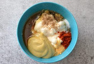 In a bowl, mix mustard, mayonnaise, honey, garlic powder, paprika, ground black pepper and a little salt.