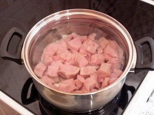 - Wash turkey meat, cut into cubes, pour cold water (two and a half liters of water), put on fire, bring to boil, remove the foam with a slotted spoon. Then cook over medium heat until ready meat. It takes about thirty minutes.