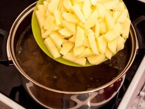 - In a slightly boiling broth with meat, put the chopped potatoes cubes, lightly salt, pepper, cook ready-to-cook potatoes for about ten minutes.