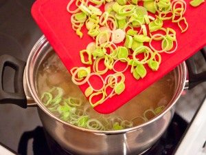 - Then add peeled and chopped leek, cook for another two minutes, remove the baking.