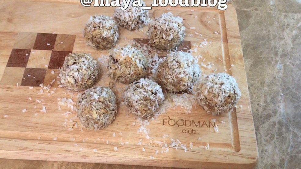- Form balls and roll in coconut.