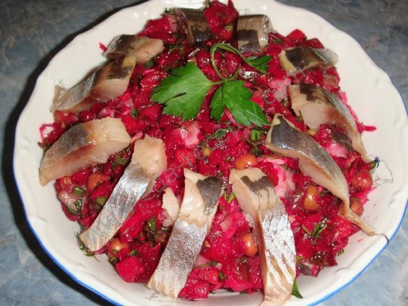 This lean homemade salad made with herring is something transitional between the usual for all vinaigrette and herring under a fur coat. Do it on a fish day during Lent if you want something tasty but modest.
