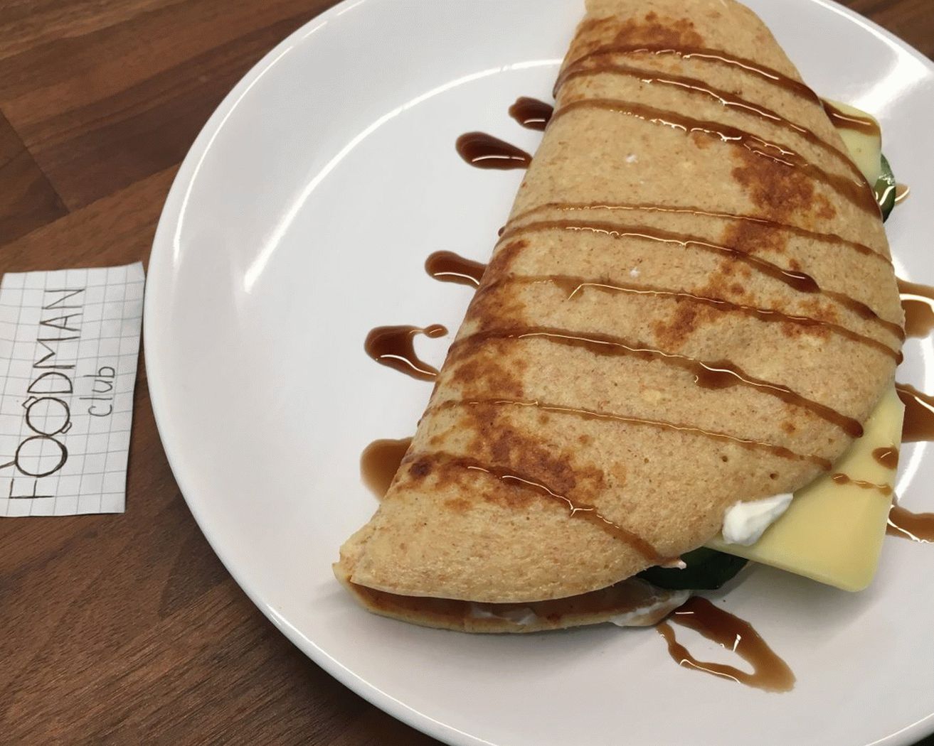 - Lubricate the finished pancake with cottage cheese, spread cucumber and cheese and add. Enjoy your meal!