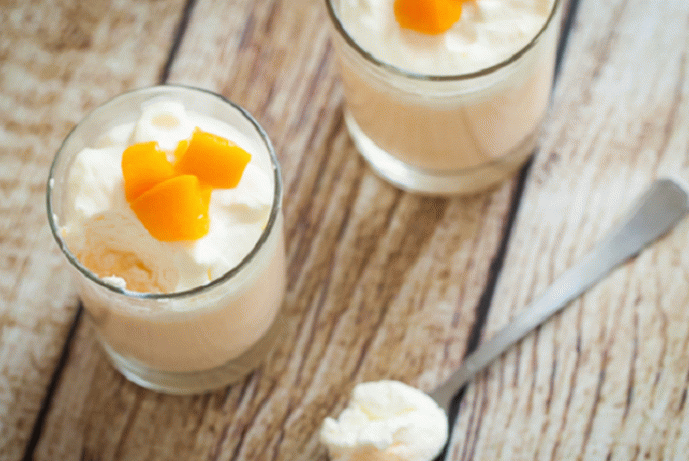- Add powdered sugar and vanilla to taste. We decorate with peaches and serve.